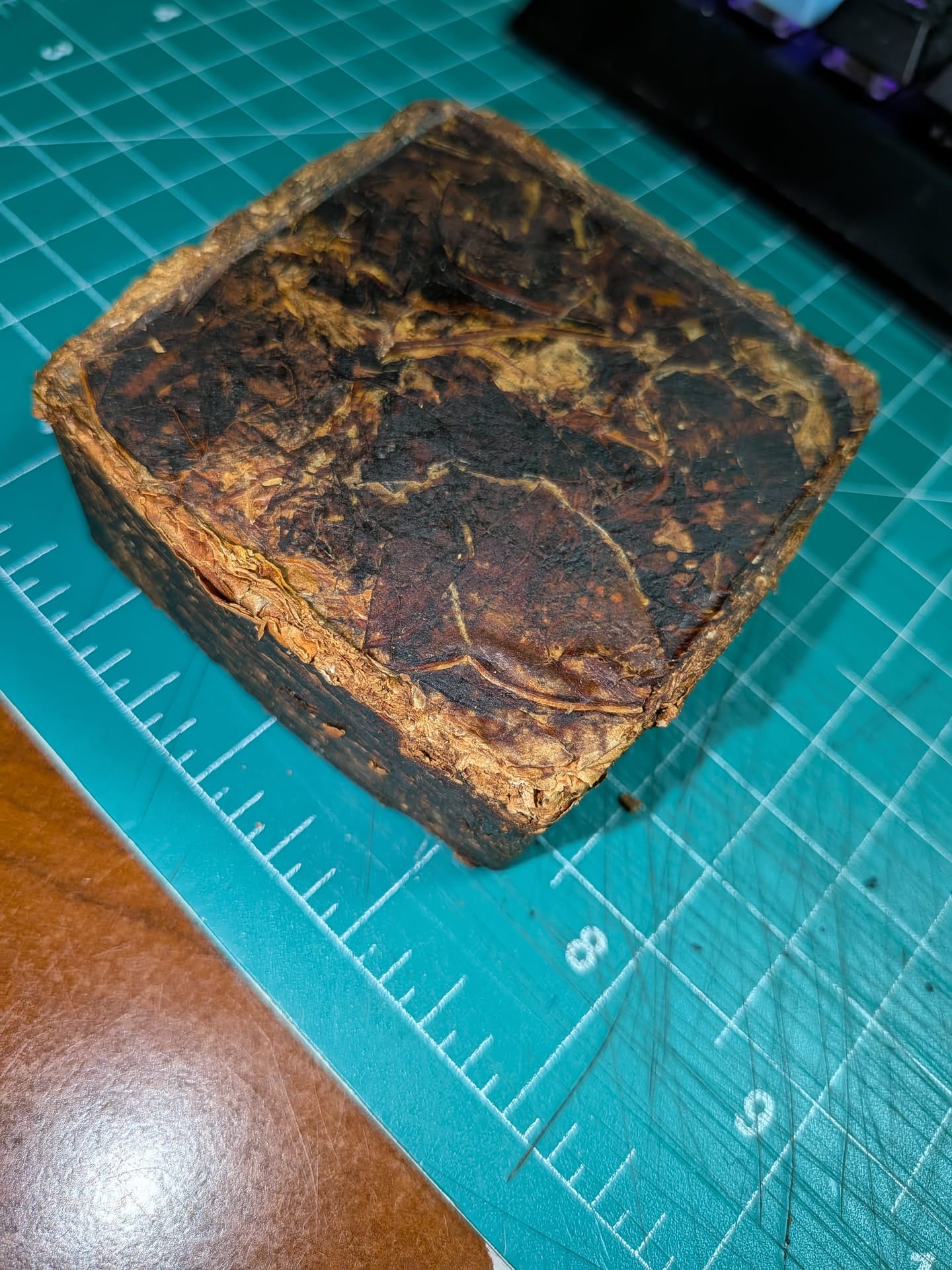 So I did somethings differently. The image above is only 1 day after pressing the plugs. Earlier this week I pulled some Red Queen Plug that was wrapped with foil and put in mylar and had some books and case of mason jars sitting on it for six months. You can see how dark the plugs became.