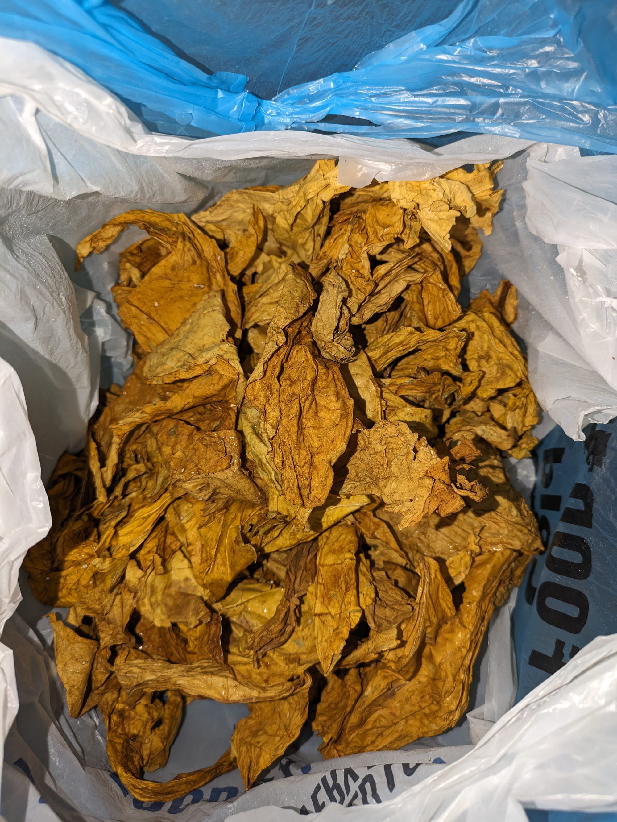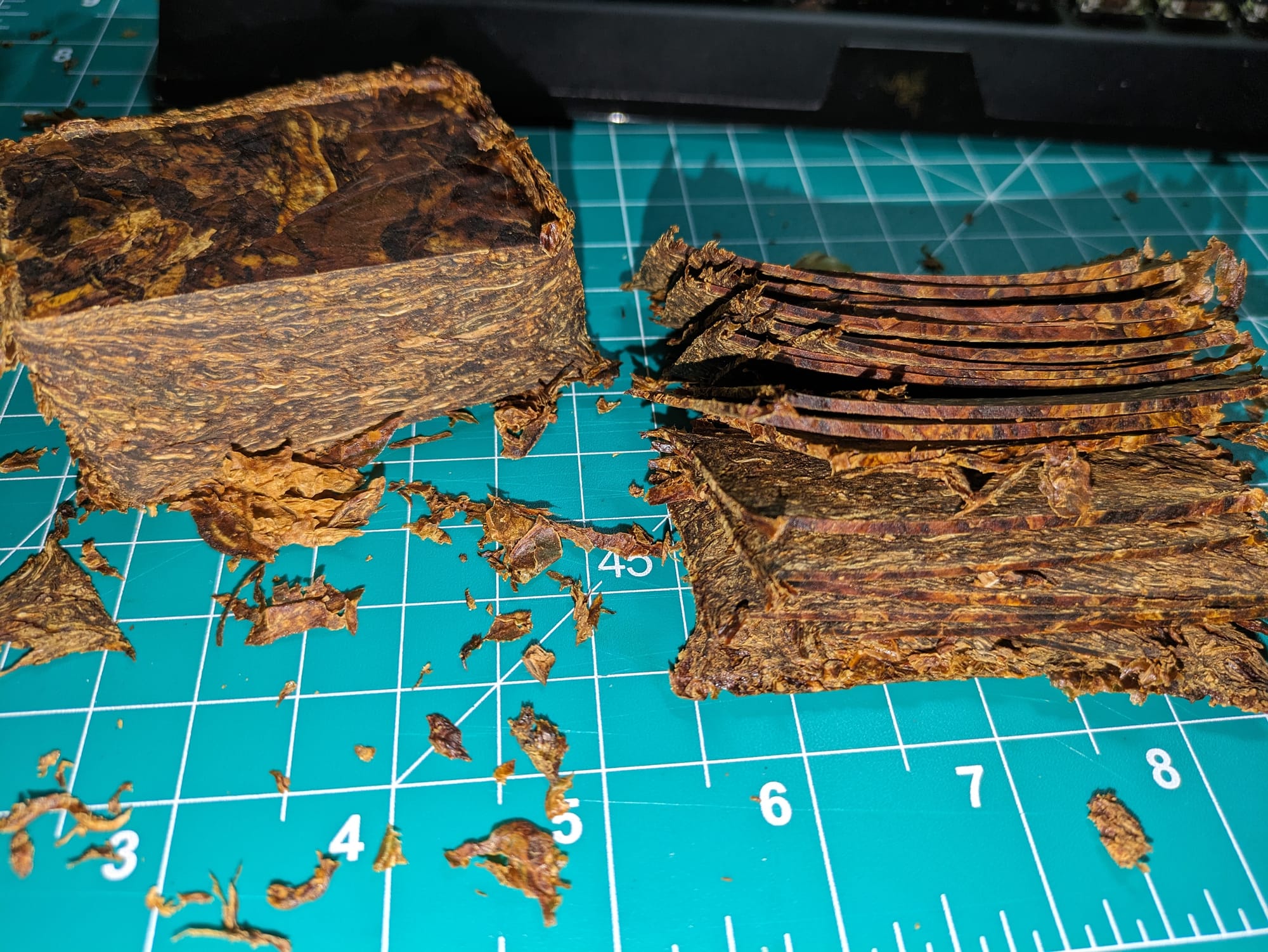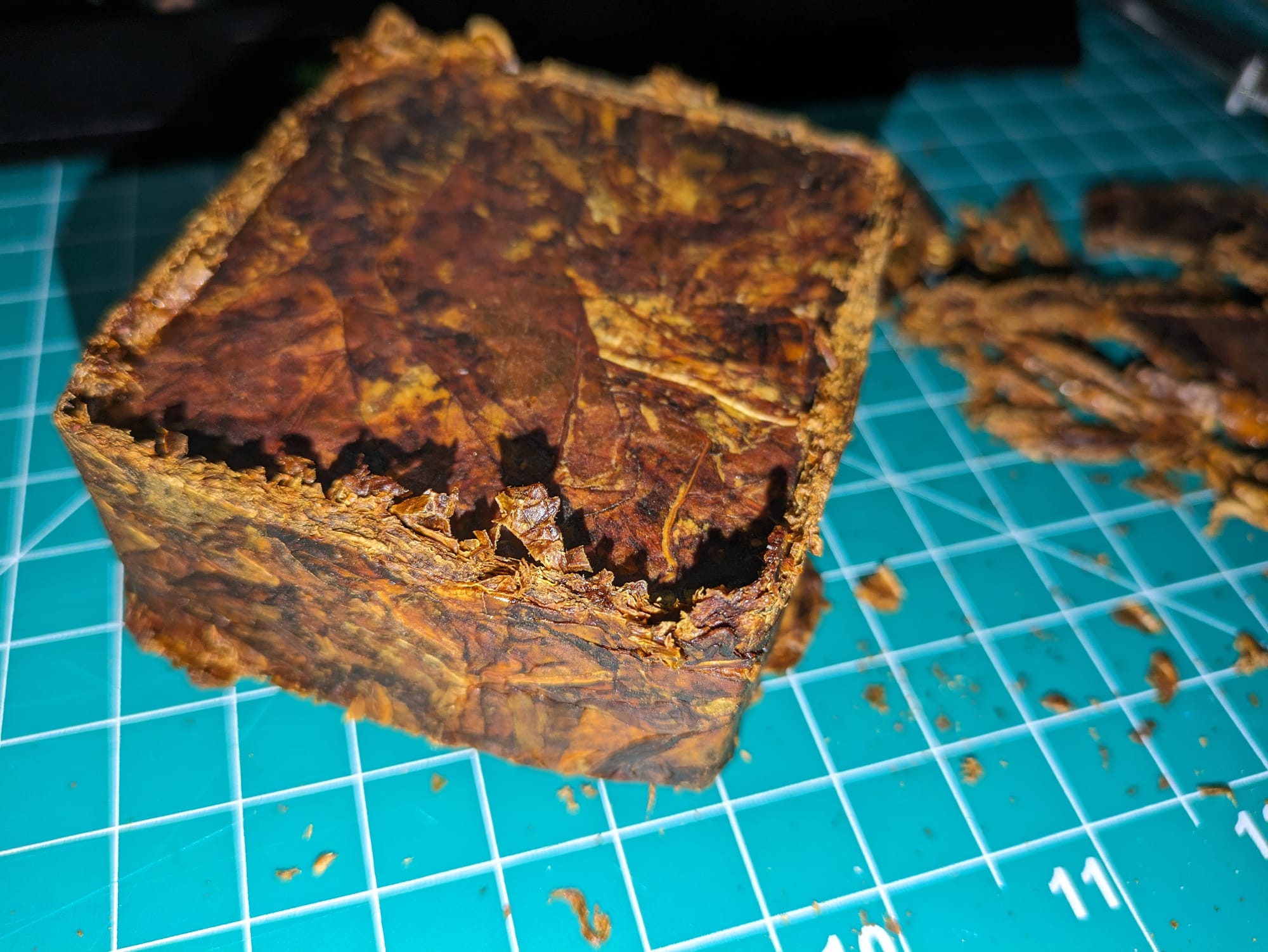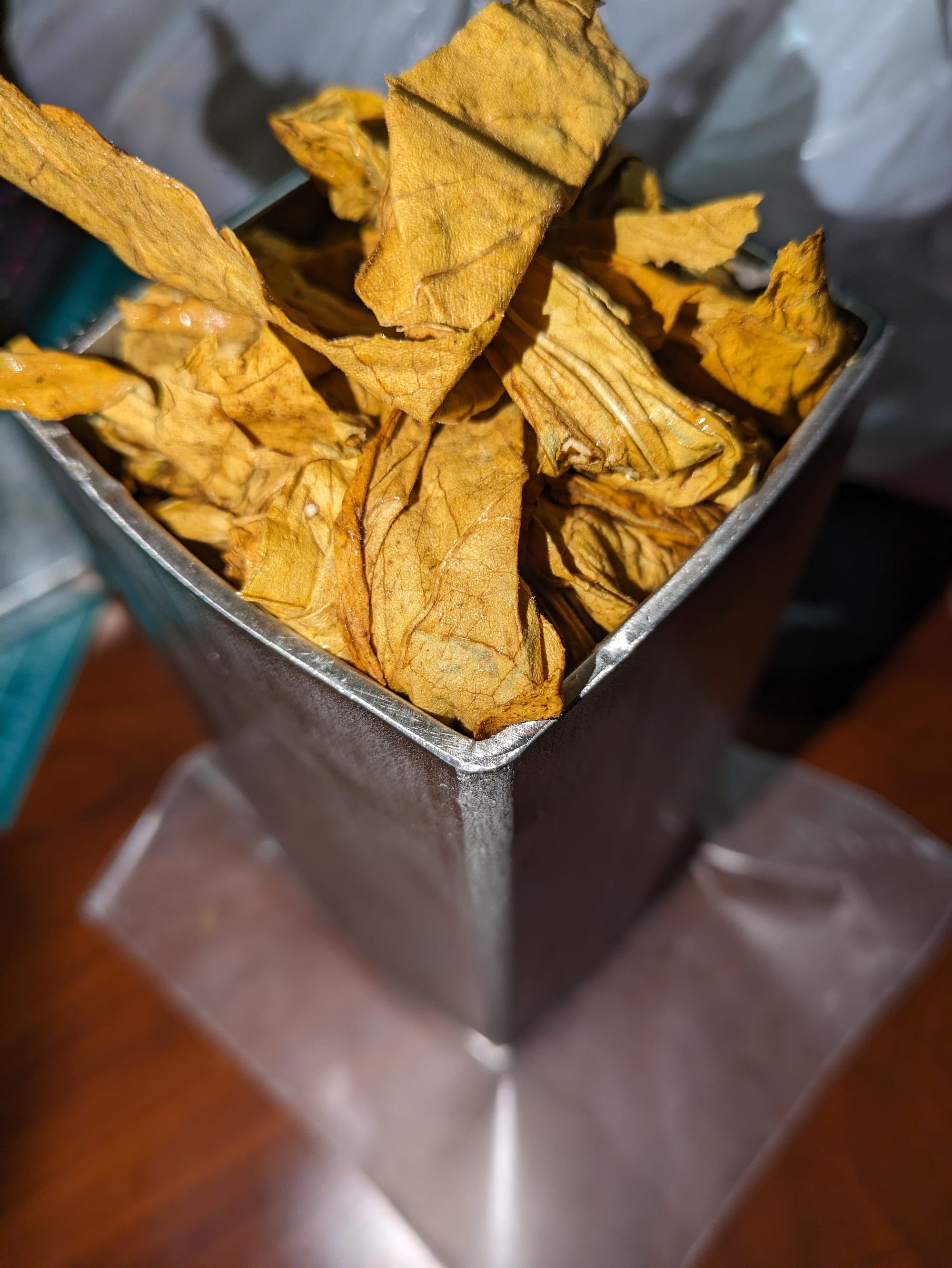 But let’s try a slight variation on this recipe and do half lemon Virginia with tonka casing and half bright Virginia with blackberry casing. Also after de-stemming 2 lbs, I settled on doing 175g plugs which works perfect on the math. Basically 1 lb de-stemmed will yield two 175g plugs. For this run I will be doing the big press and do all 4 plugs at once. Next week should be a hot one here in North Carolina so I will let it stove in the cab of the truck next week while pressed.
