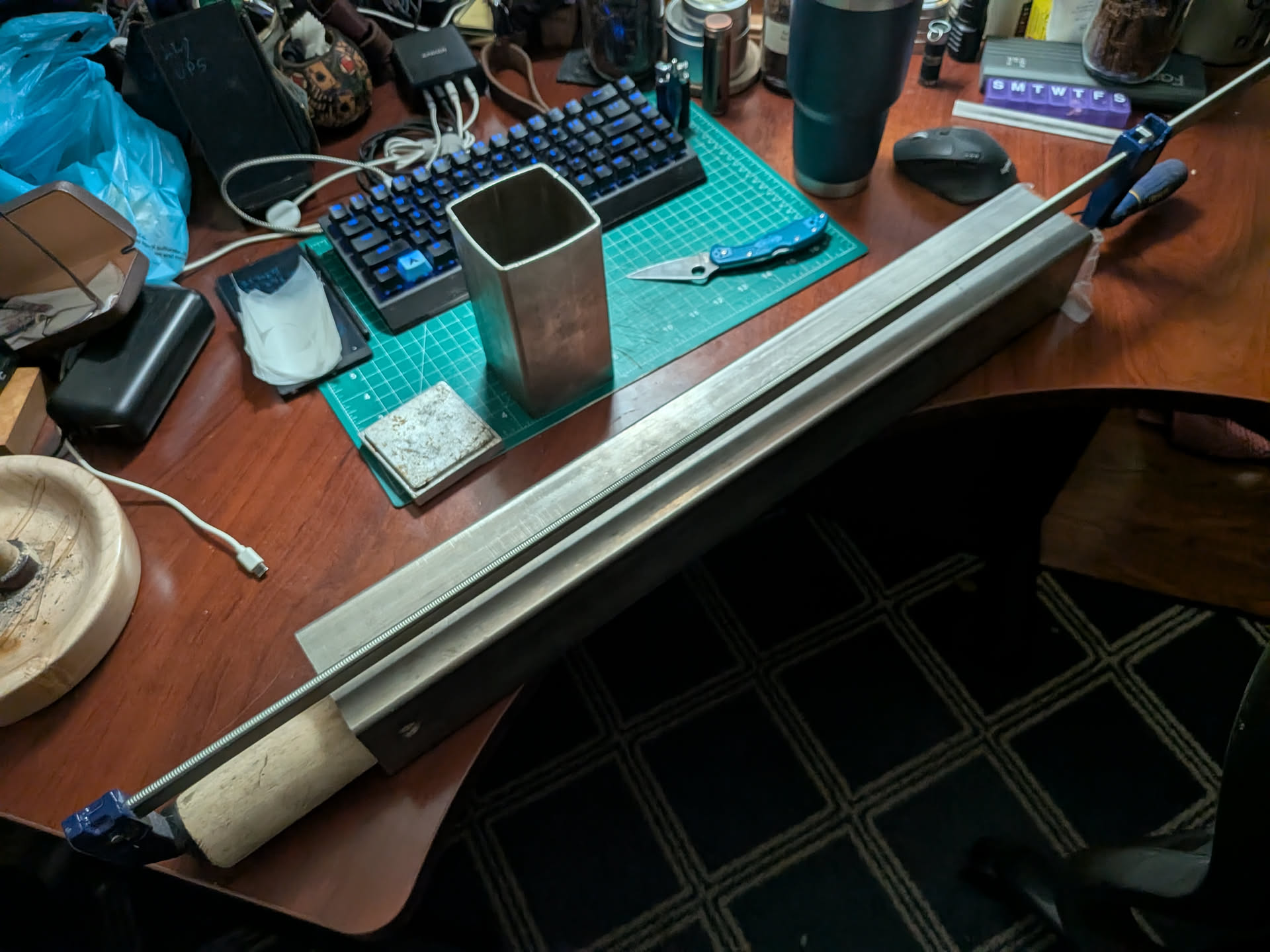 Next I took the four 200g plugs and stuffed them in a smaller stainless steel tube with double parchment paper to make it easier to separate and press it one more time and put a C-clamp on, wrap in aluminum foil and stove for 4 hours at 200F.